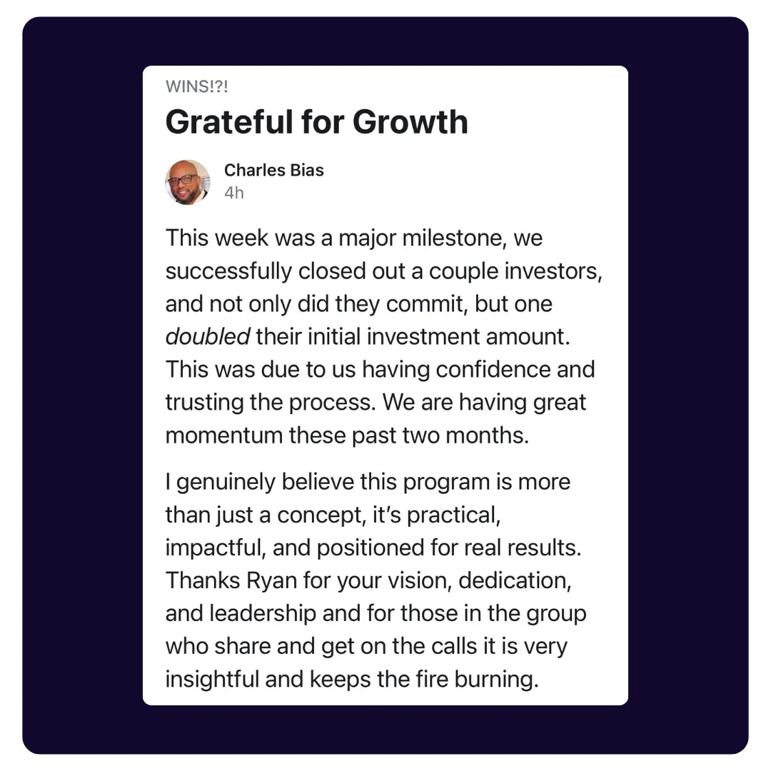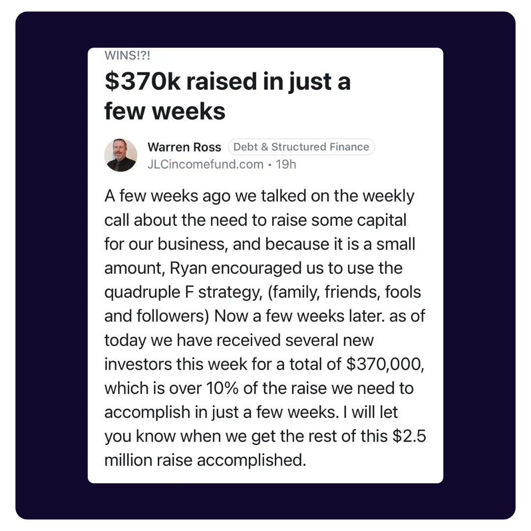 Within his first 3 months, he raised $4M for one deal. Now he has full confidence he can complete a raise for any deal they have.